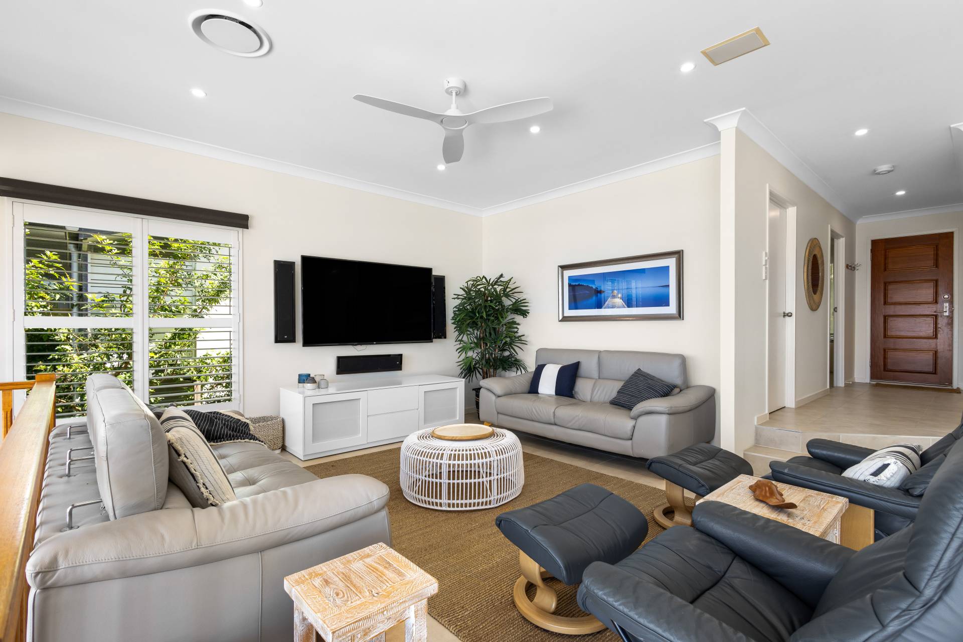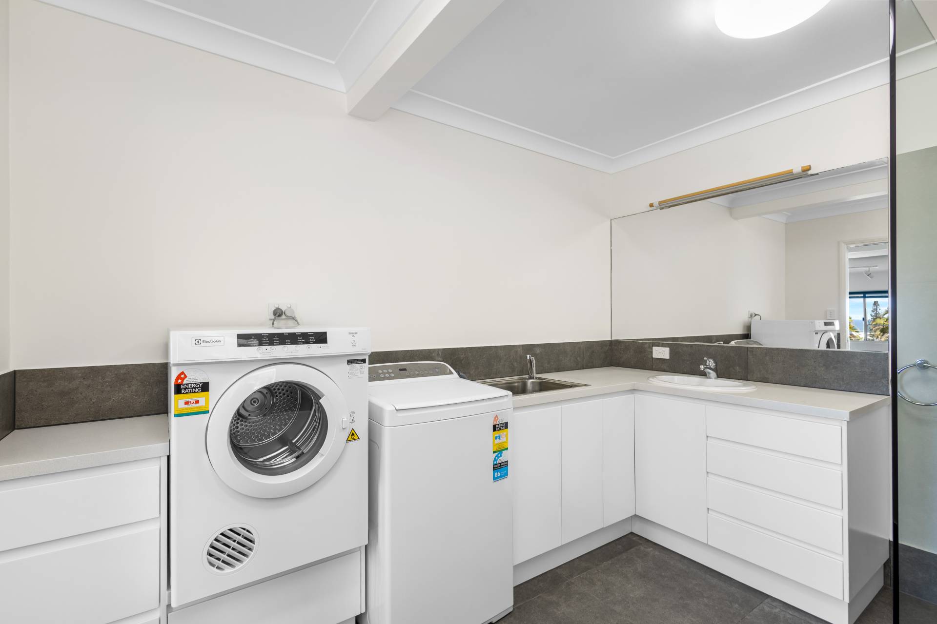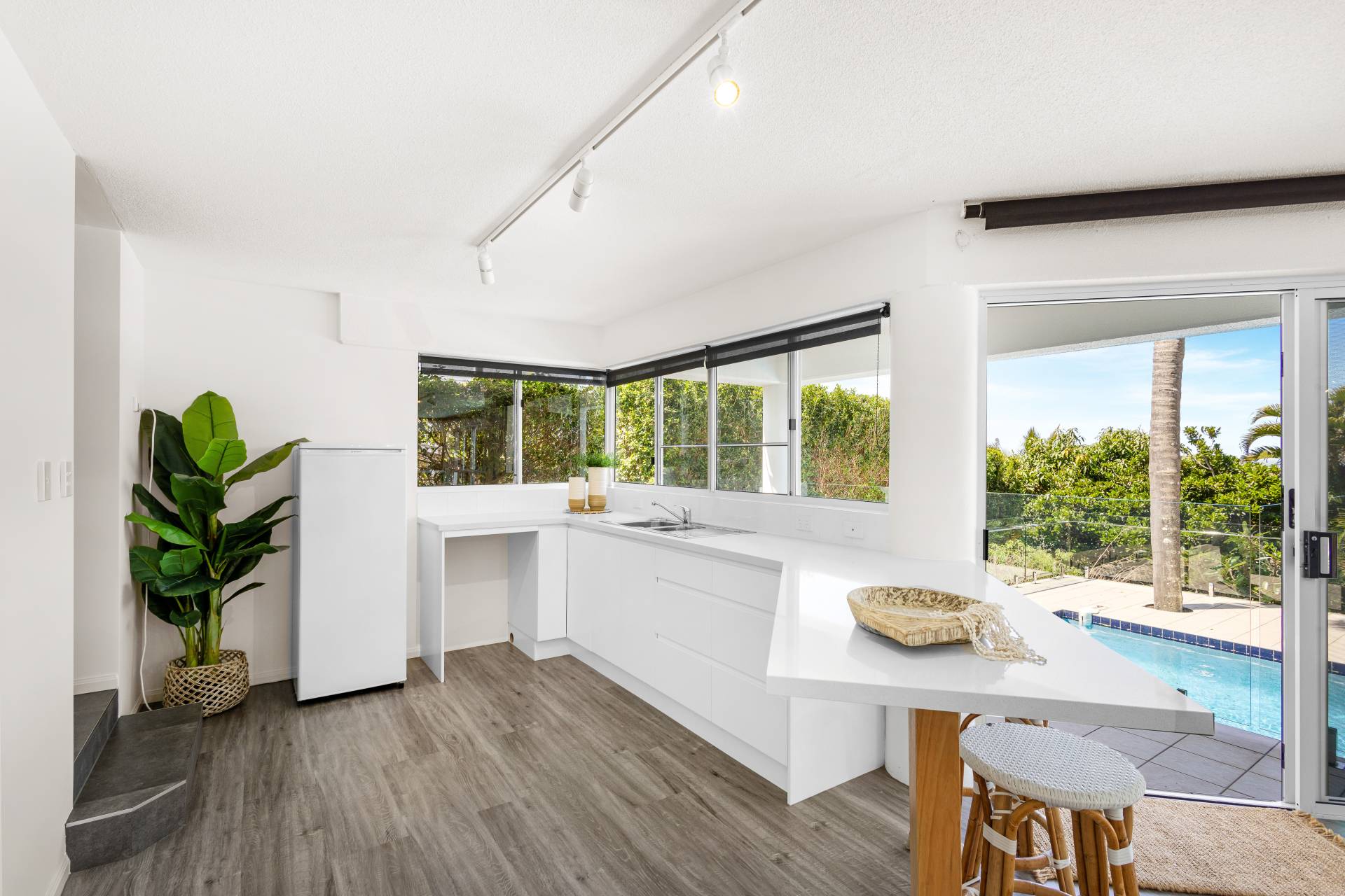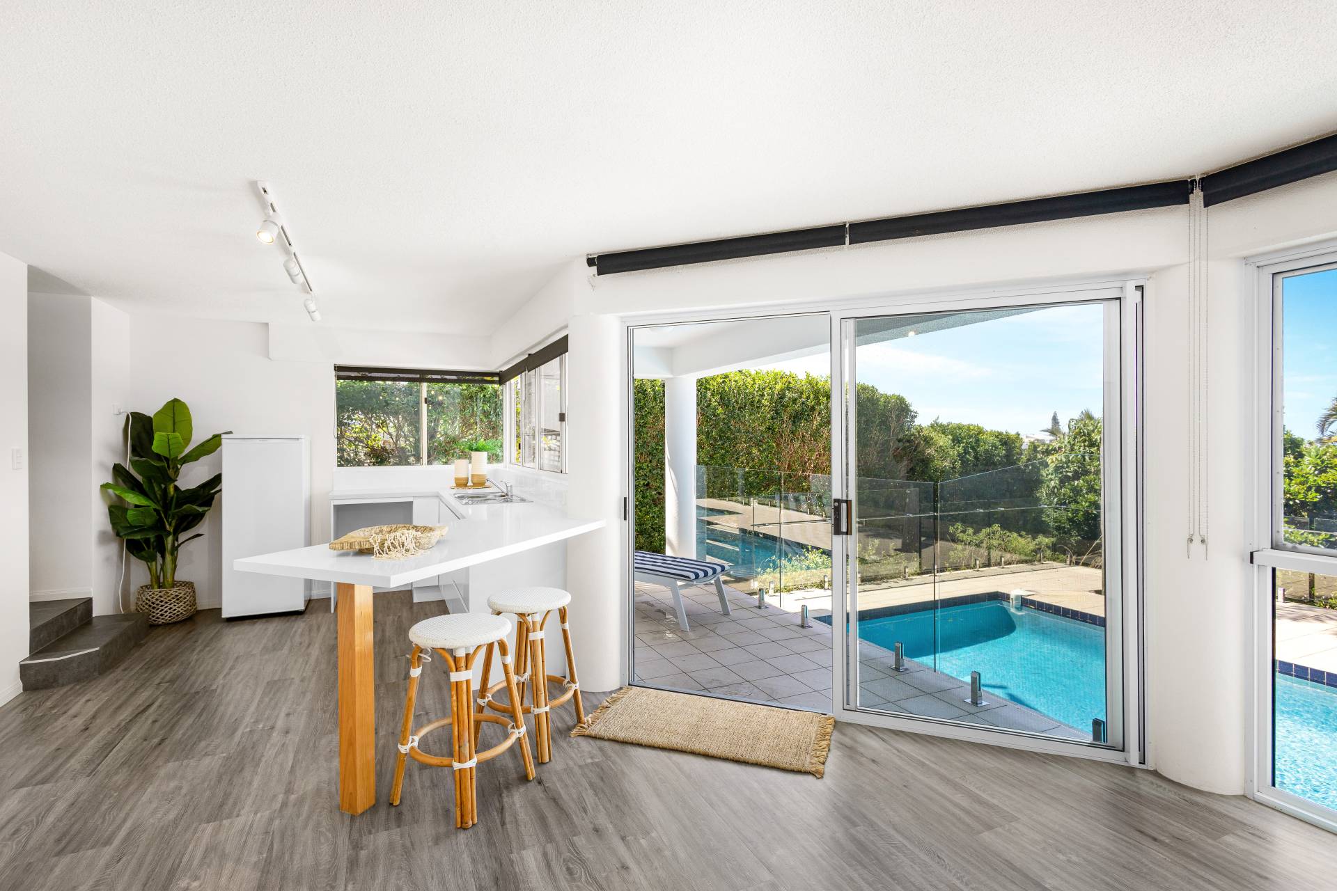 Downstairs is a huge second living area with it's own wet bar and fridge, and access out to the lap pool.  There is also a large laundry incorporating a shower, a separate toilet, and an outdoor shower to wash the sand off before hopping in the pool.  There are roller blinds on every window to keep some of the heat out in summer.