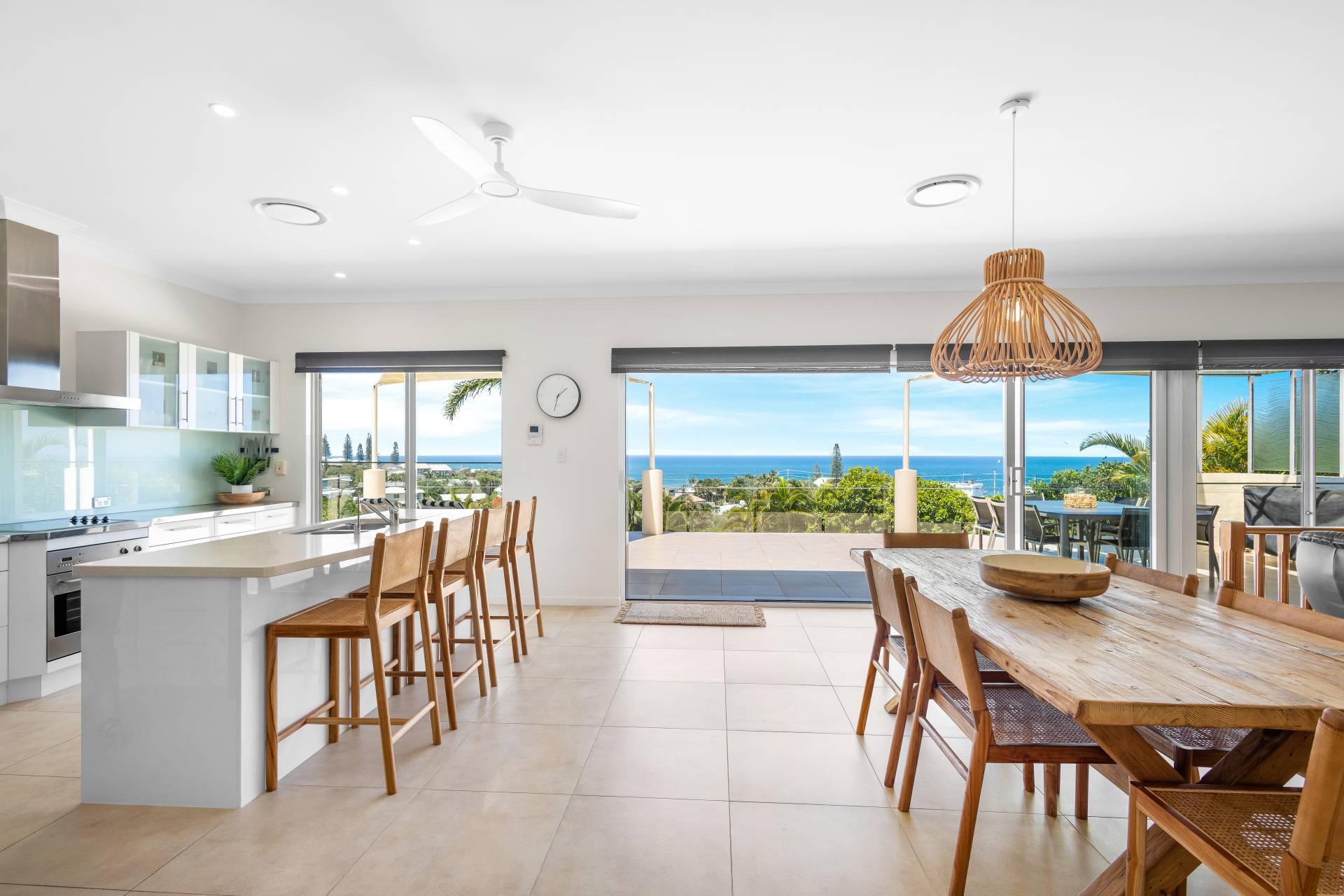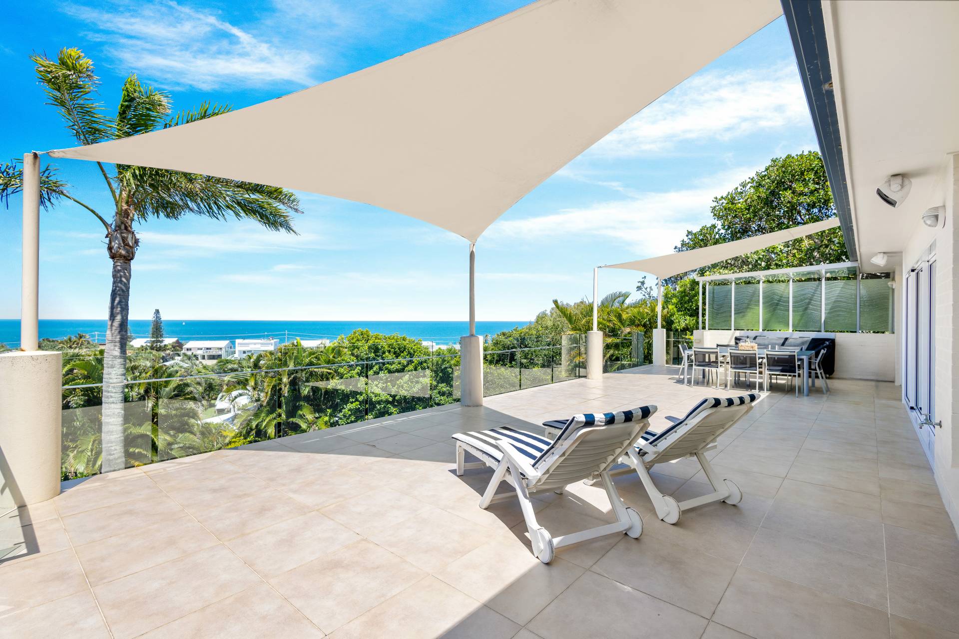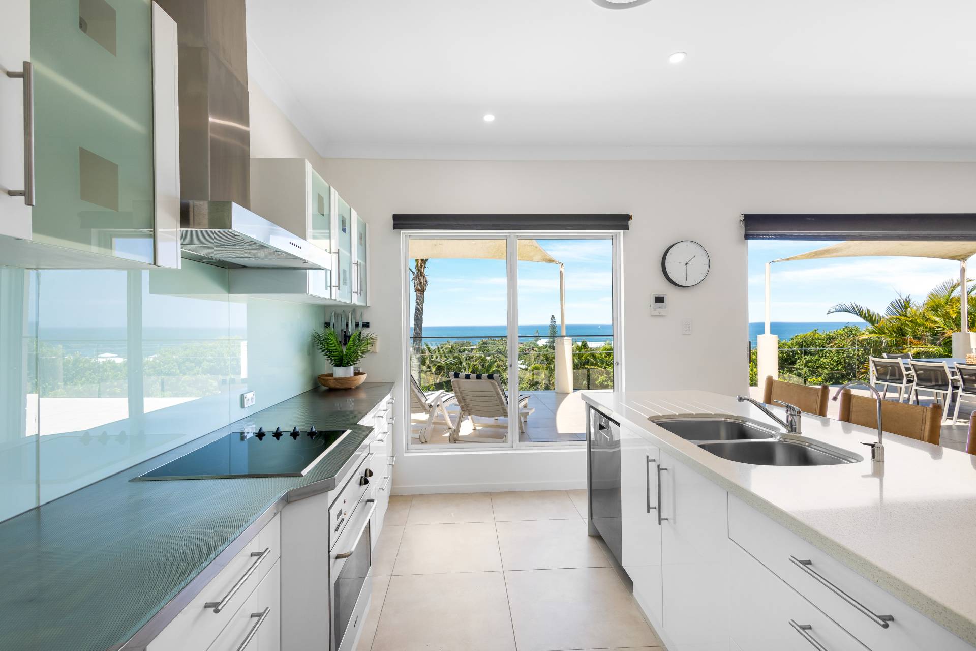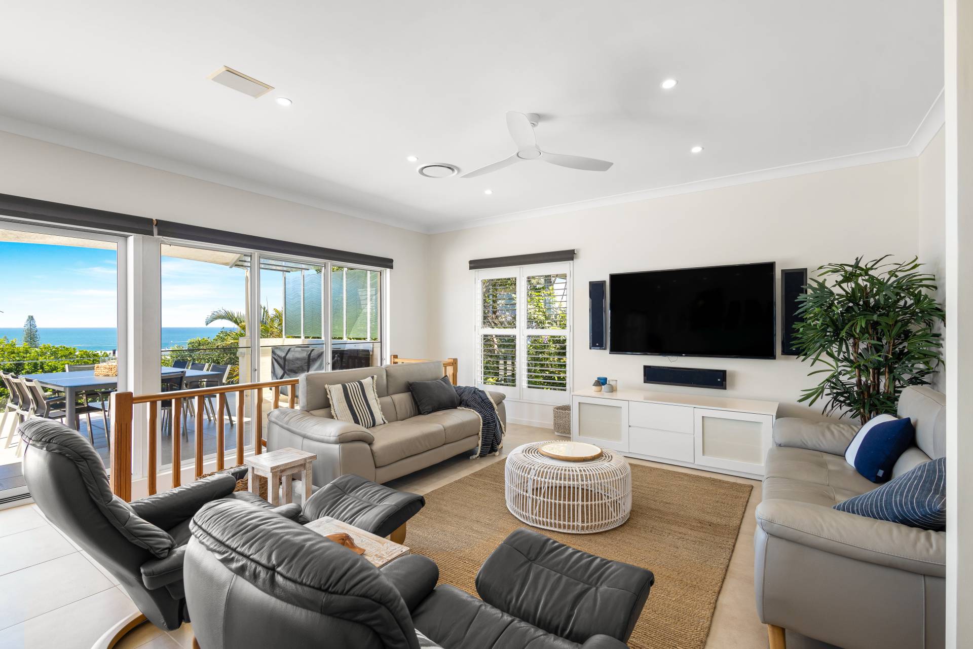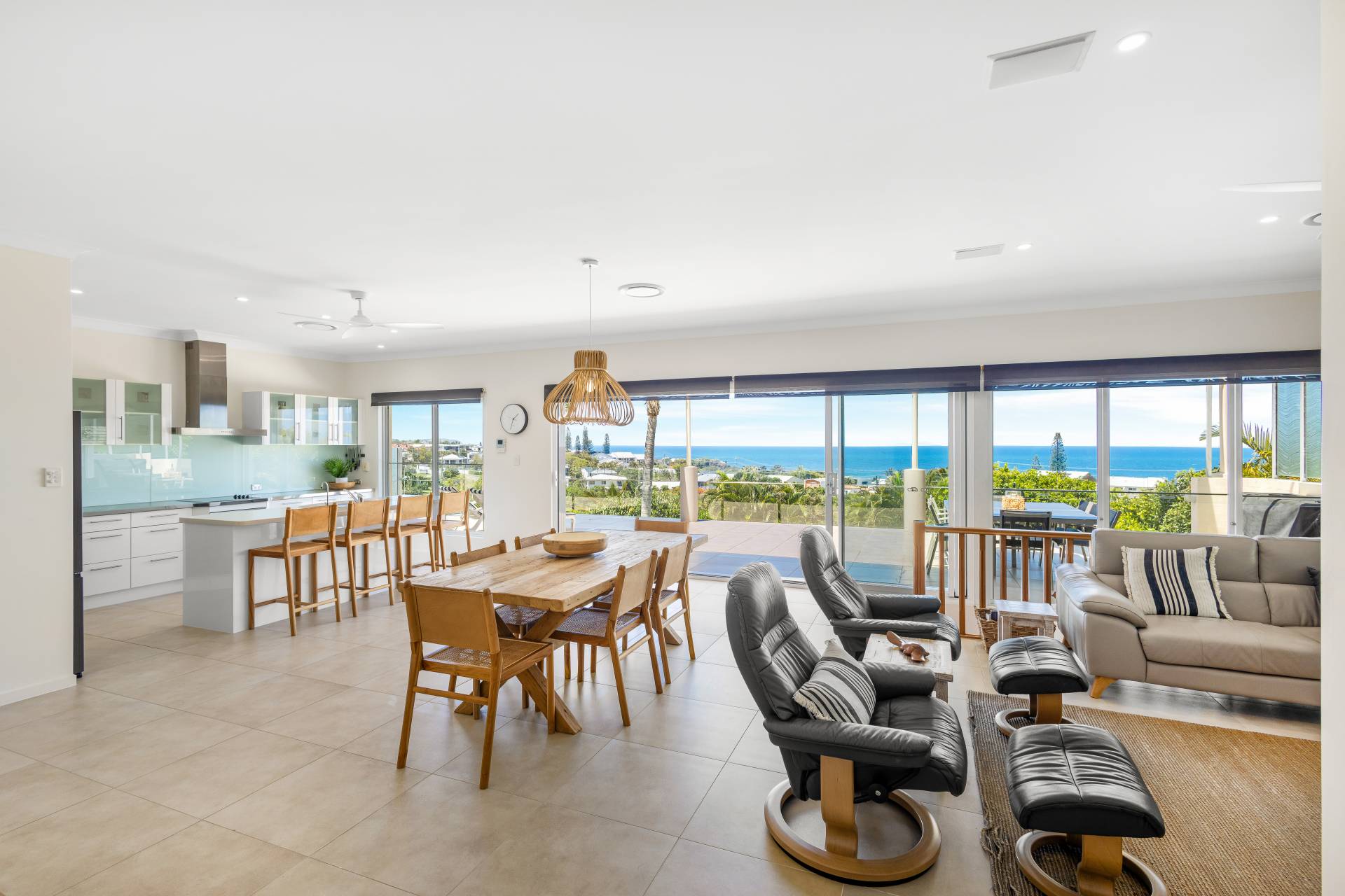 Moving past these front bedrooms and the guest powder room, your eyes are immediately drawn to the view of the ocean.  The main living area upstairs is open plan with large windows and stacker doors allowing expansive views of the ocean.  The kitchen has an island bench, plenty of storage and preparation space, appliance hutch and large corner pantry.  Living and dining areas allow plenty of space for friends and family to mingle, and there is a large deck running the entire width of the house overlooking both the lap pool on the lower level, and the boats and surfers,  (or whales if you are lucky) frolicking in the ocean beyond.  Recliners and a large table with 8 seats next to the BBQ give plenty of options for rest or relaxation.