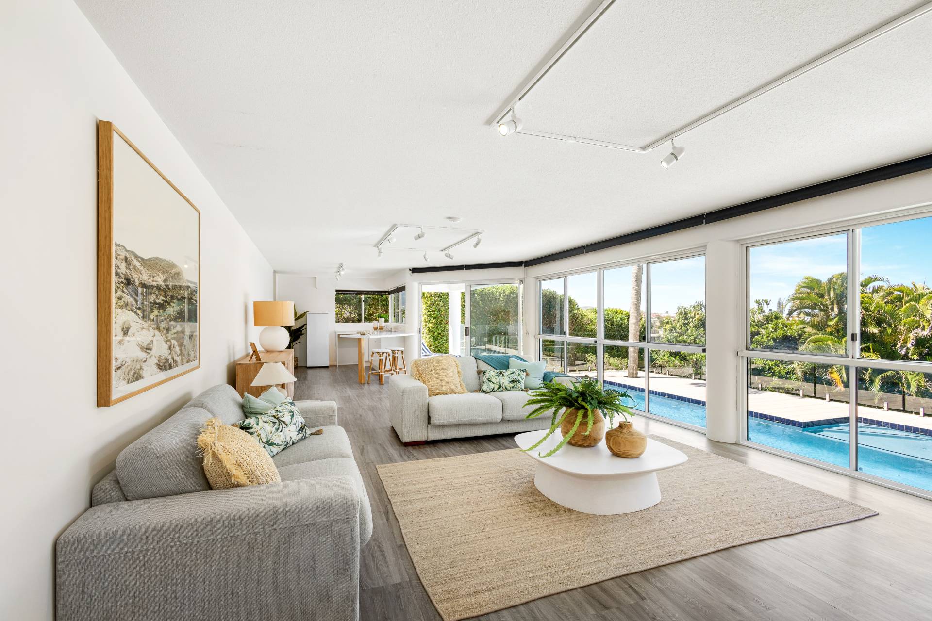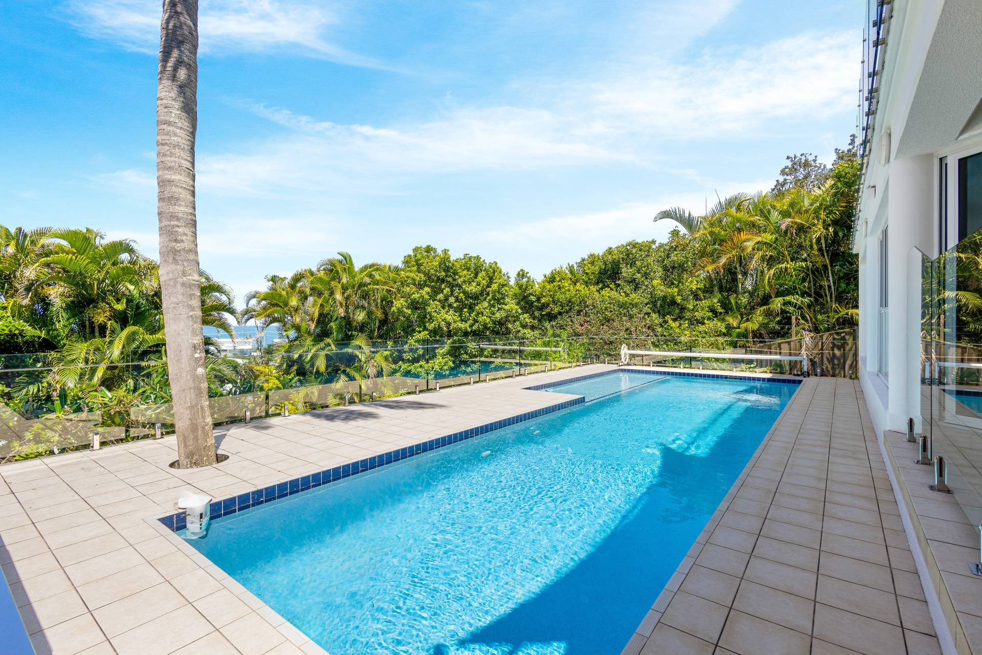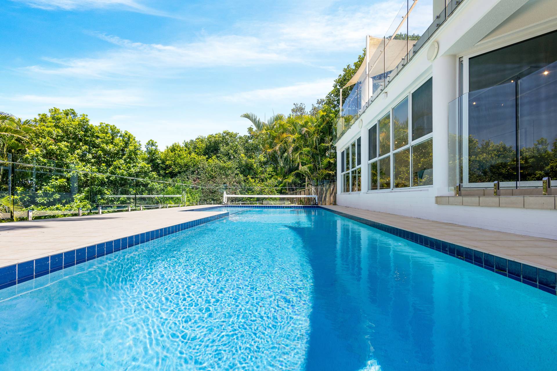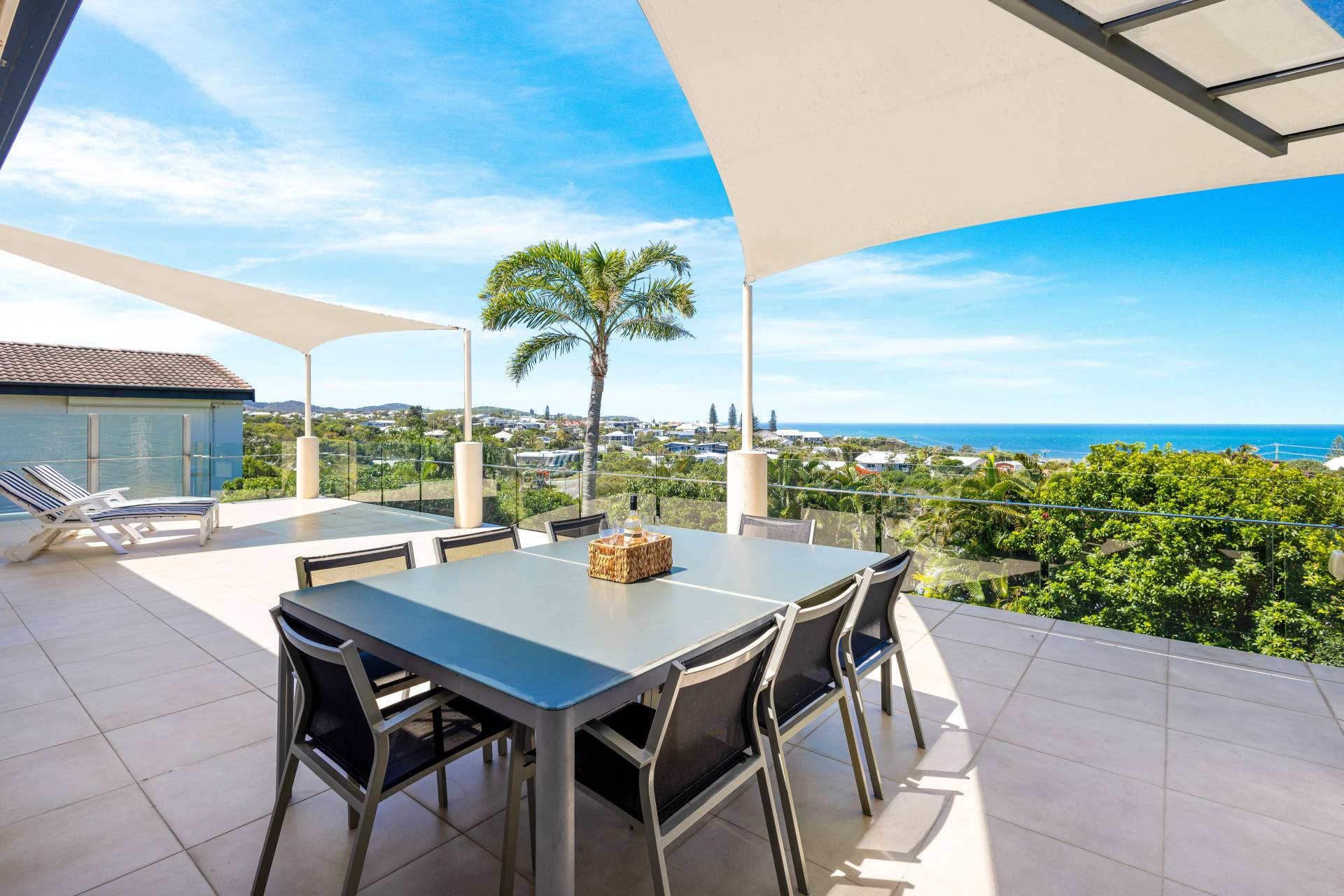 Moving past these front bedrooms and the guest powder room, your eyes are immediately drawn to the view of the ocean.  The main living area upstairs is open plan with large windows and stacker doors allowing expansive views of the ocean.  The kitchen has an island bench, plenty of storage and preparation space, appliance hutch and large corner pantry.  Living and dining areas allow plenty of space for friends and family to mingle, and there is a large deck running the entire width of the house overlooking both the lap pool on the lower level, and the boats and surfers,  (or whales if you are lucky) frolicking in the ocean beyond.  Recliners and a large table with 8 seats next to the BBQ give plenty of options for rest or relaxation.
