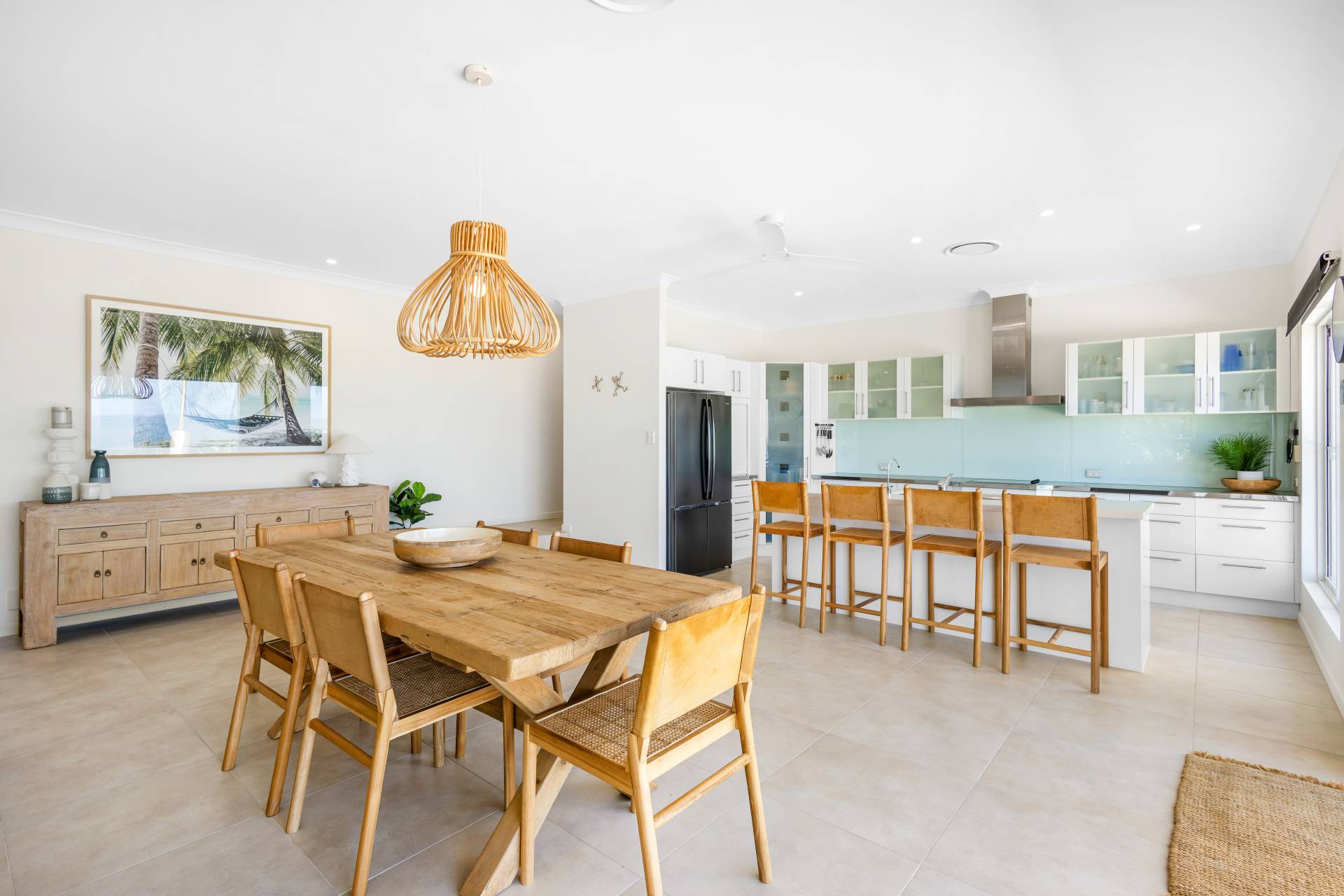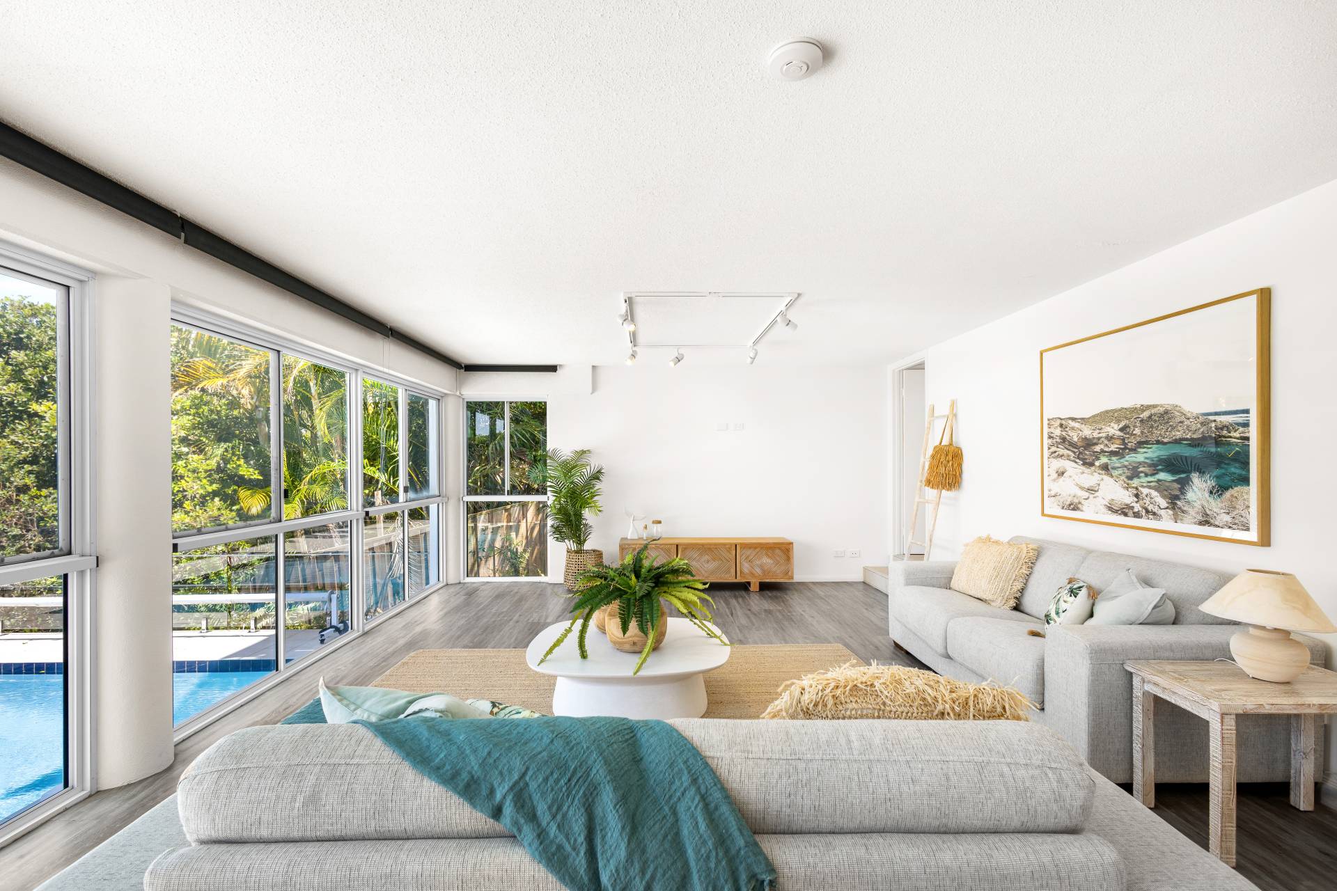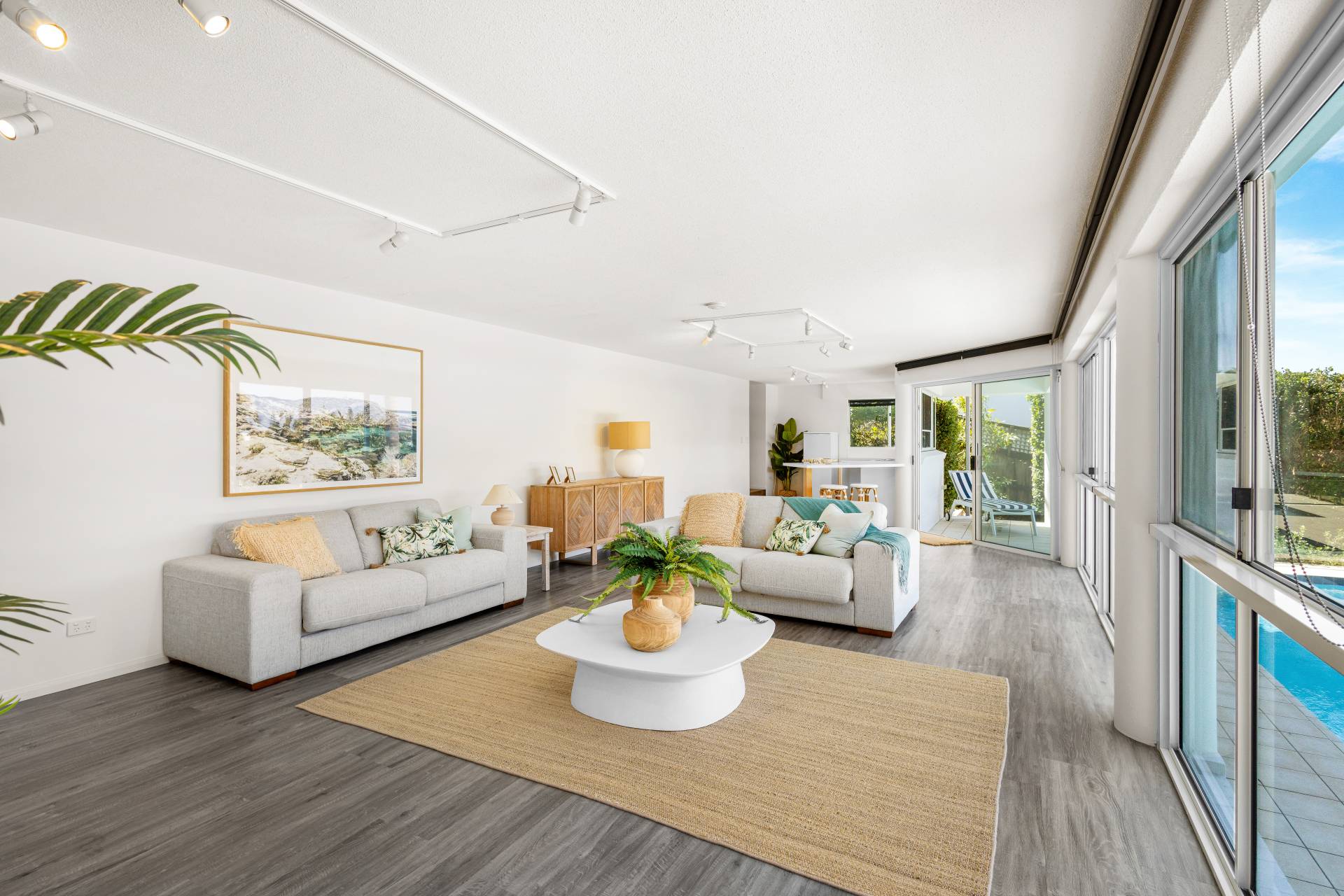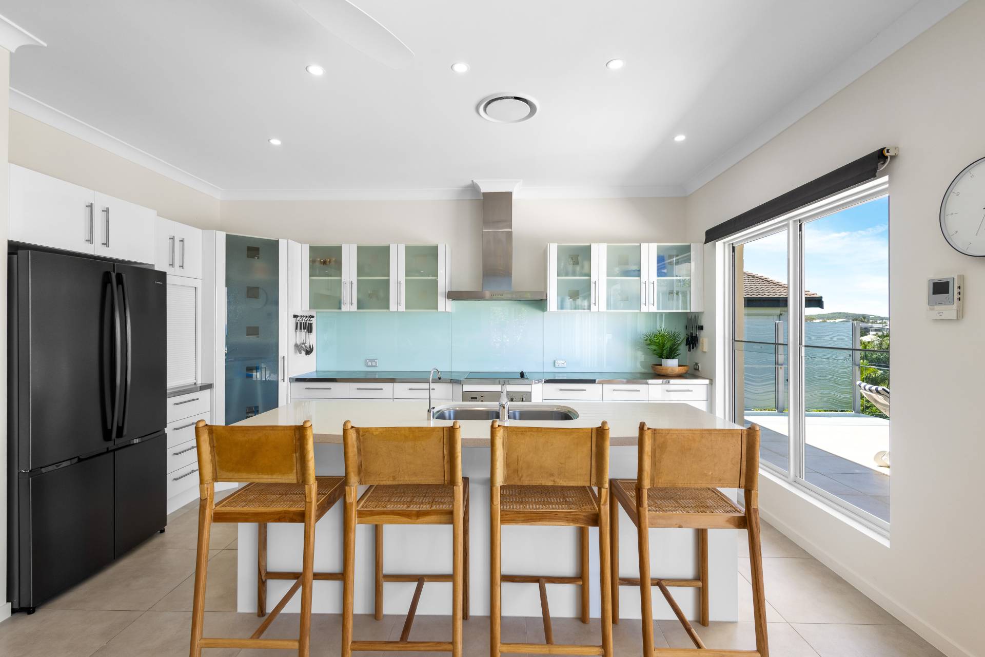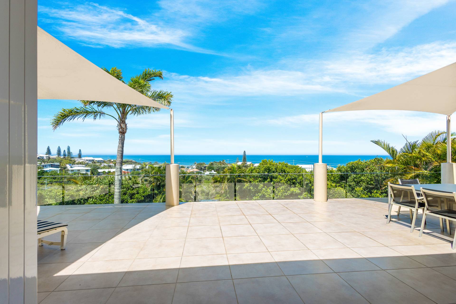 Moving past these front bedrooms and the guest powder room, your eyes are immediately drawn to the view of the ocean.  The main living area upstairs is open plan with large windows and stacker doors allowing expansive views of the ocean.  The kitchen has an island bench, plenty of storage and preparation space, appliance hutch and large corner pantry.  Living and dining areas allow plenty of space for friends and family to mingle, and there is a large deck running the entire width of the house overlooking both the lap pool on the lower level, and the boats and surfers,  (or whales if you are lucky) frolicking in the ocean beyond.  Recliners and a large table with 8 seats next to the BBQ give plenty of options for rest or relaxation.