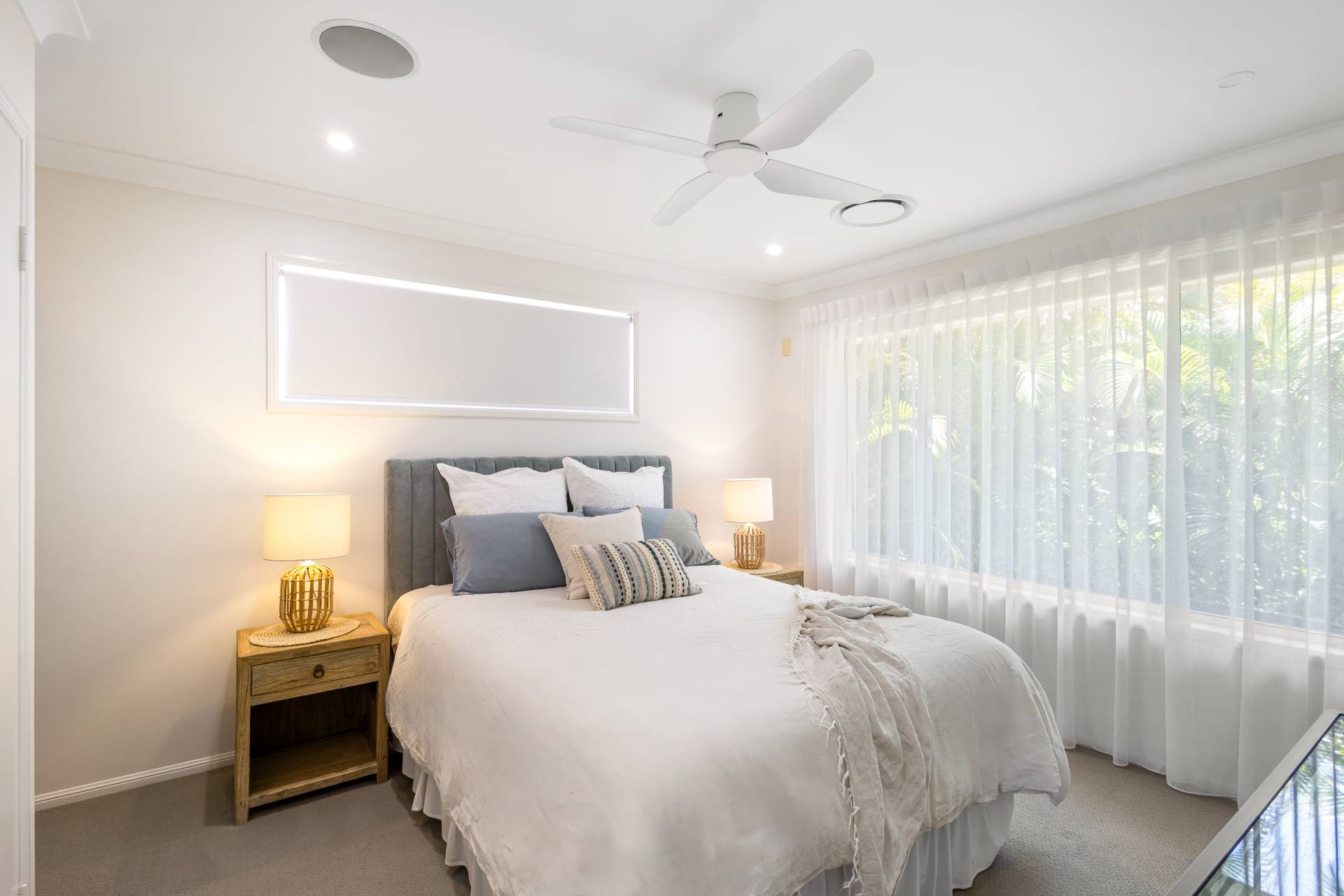 On the opposite side of the house to the entry hall is another bedroom and large main bathroom with spa bath and shower.  The lovely master suite is also on this side with a good size ensuite, and ocean views to accompany your morning cup of coffee in bed.  The upper level has electric blinds on the ocean side of the house if you feel like delaying sunrise for a while, and there is ducted air-con throughout the top level of the home.